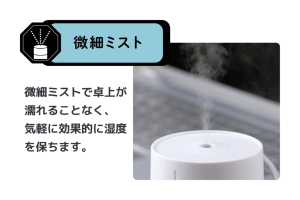微細ミストで卓上が濡れることなく、気軽に効果的に湿度を保ちます。
