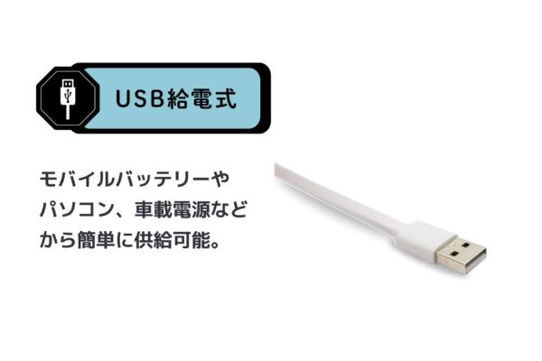 モバイルバッテリーやパソコン、車載電源などから供給可能。