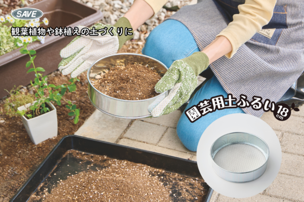 鉢植えやプランター、家庭菜園の土づくりに役立つ園芸用の土ふるい(直径18cm)です。