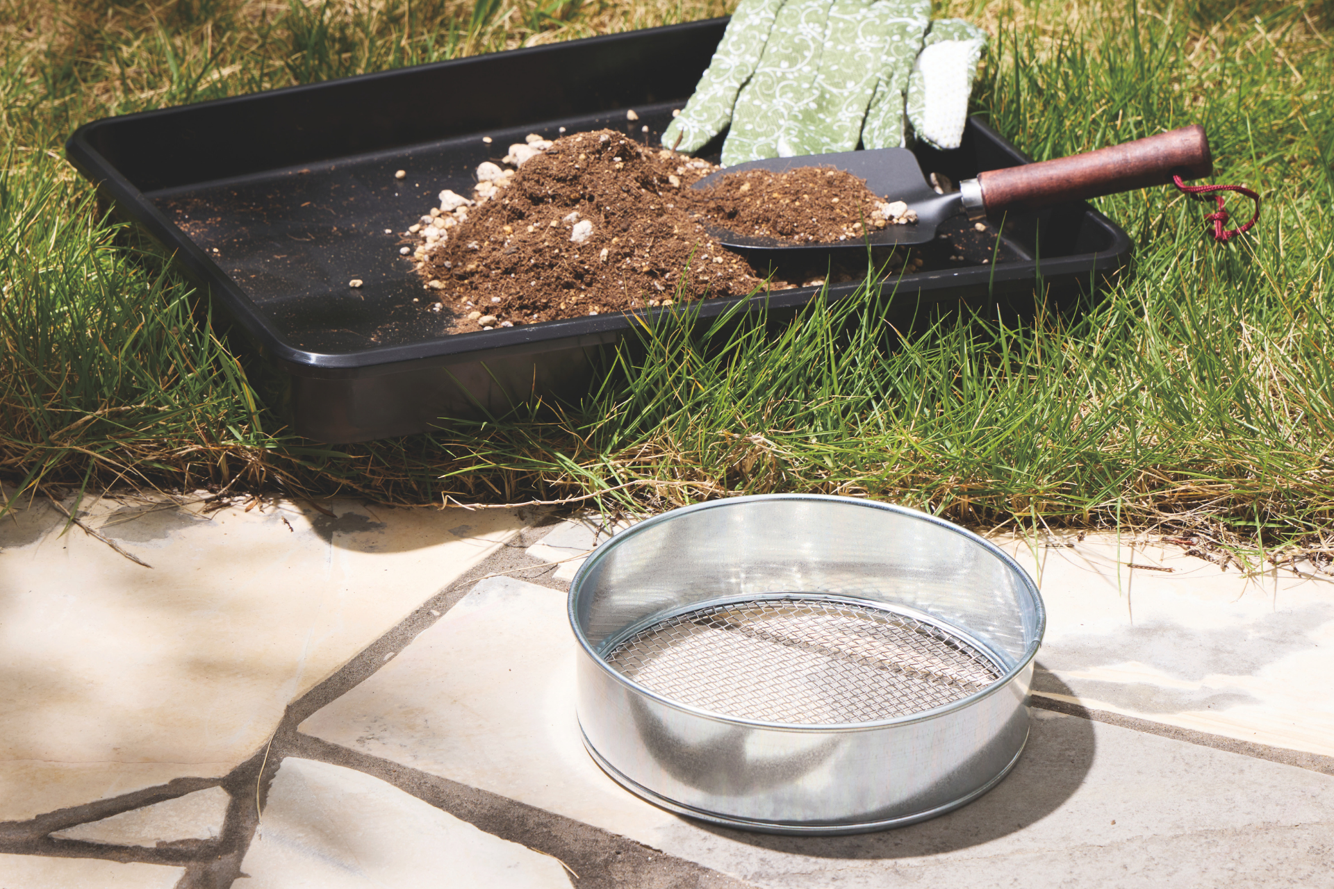 鉢植えやプランター、家庭菜園の土づくりに役立つ園芸用の土ふるい(直径18cm)です。