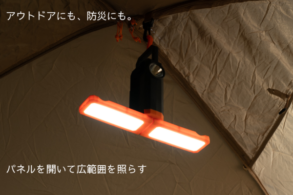 パネルを開くことで広範囲を照らすランタンとして、閉じた状態では懐中電灯として使用できる多機能ライトです。